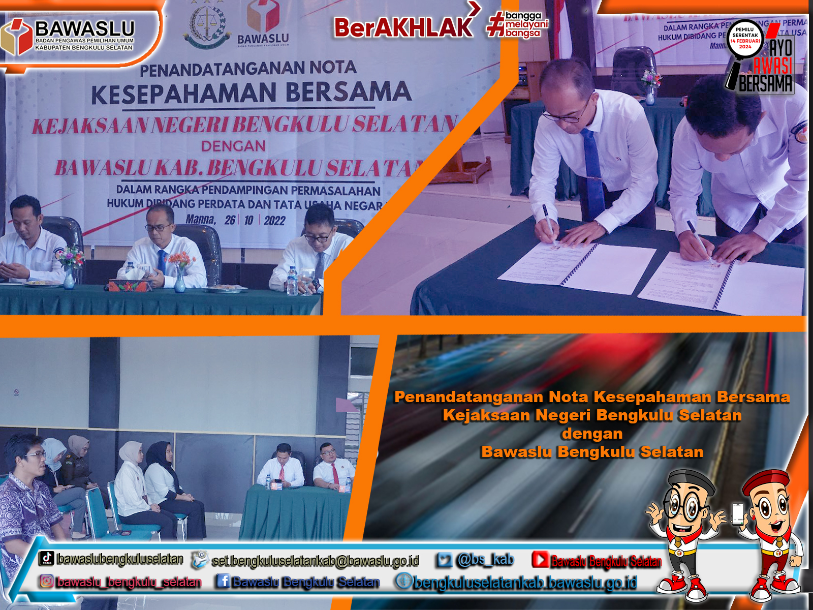 Bawaslu Bengkulu Selatan, Ketua Bawaslu Kabupaten Bengkulu Selatan Azes Digusti bersama Kepala Kejaksaan Negeri Bengkulu Selatan Hendri Hanafi, menandatangani Nota Kesepahaman Tentang Penanganan Masalah Hukum Perdata dan Tata Usaha Negara. Rabu, 26/10/2022.