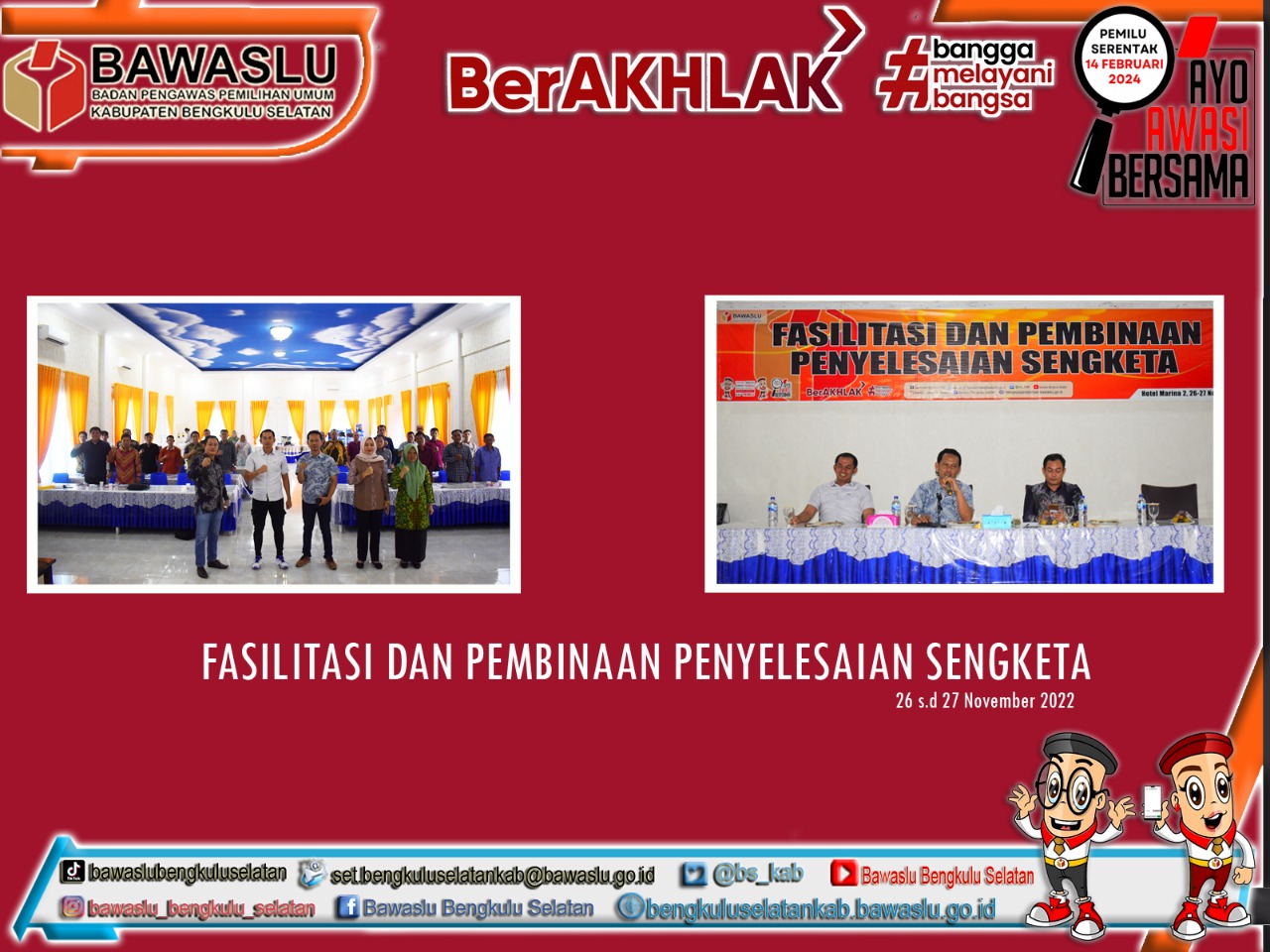Bawaslu Bengkulu Selatan. Dalam hal persiapan penyelesaian sengketa Pemilu Tahun 2024, Bawaslu Bengkulu Selatan melakukan Rapat Koordinasi Fasilitasi dan Pembinaan Penyelesaian Sengketa bersama Anggota Panwascam Se-Kabupaten Bengkulu Selatan Sabtu dan Minggu tanggal 26 s.d 27 November 2022 di Hotel Marina 2.
