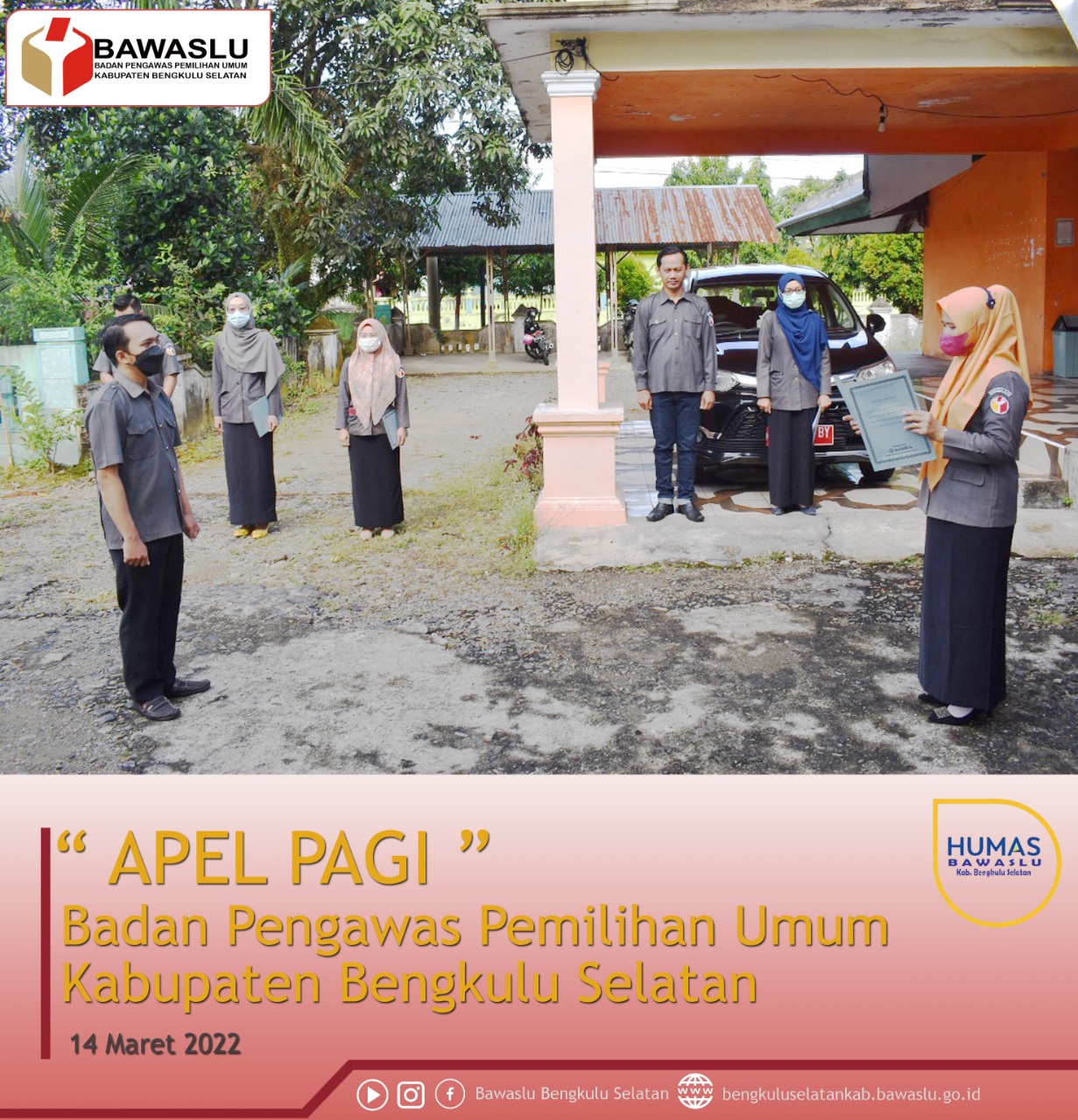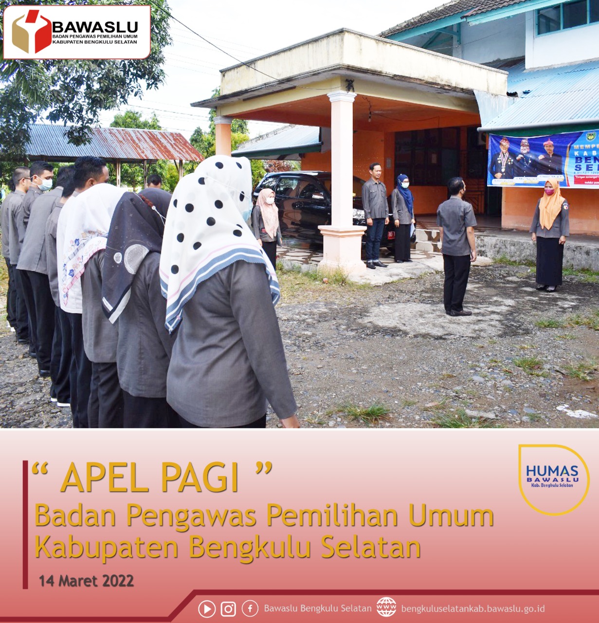 Kota Manna, Bengkulu Selatan – Bertempat di halaman Sekretariat Bawaslu Kabupaten Bengkulu Selatan, Ketua Serta seluruh jajaran Bawaslu kabupaten Bengkulu Selatan melaksanakan apel pagi pada Senin, 14 Maret 2022. Apel pagi merupakan rutinitas yang wajib dilaksanakan pada hari Senin sebagai bentuk dari kedisiplinan dan tanggung jawab para pegawai di lingkungan Bawaslu Kabupaten Bengkulu Selatan.