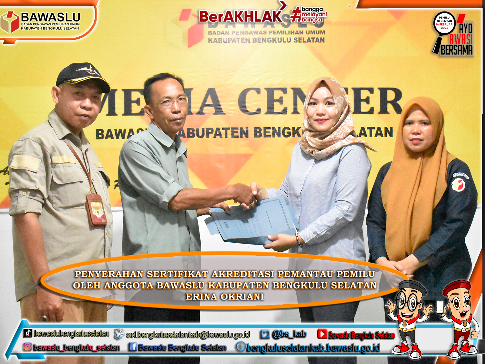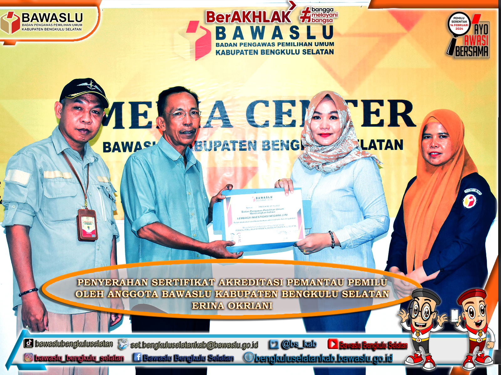 Bawaslu Bengkulu Selatan. Anggota Bawaslu Bengkulu Selatan Erina Okriani menyerahkan sertifikat Akreditasi Pemantau Pemilu kepada Organisasi Lembaga Investigasi Negara (LIN). Senin, 26 Desember 2022.