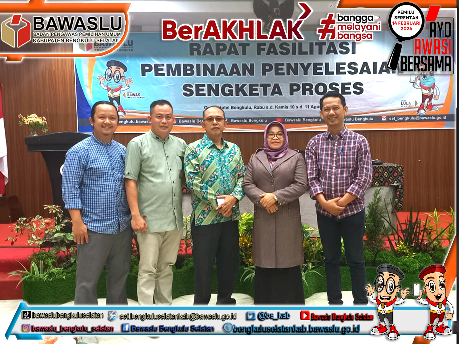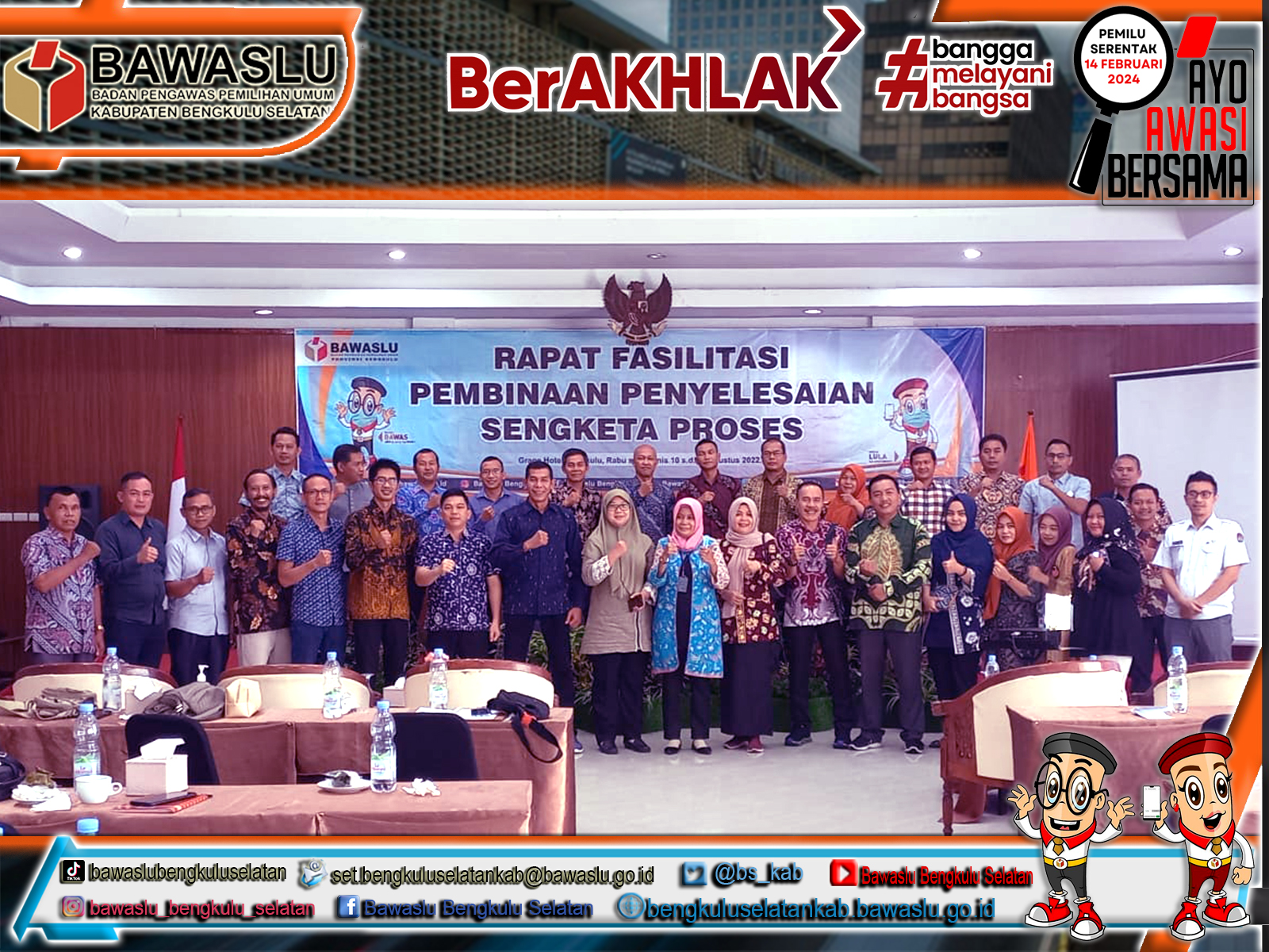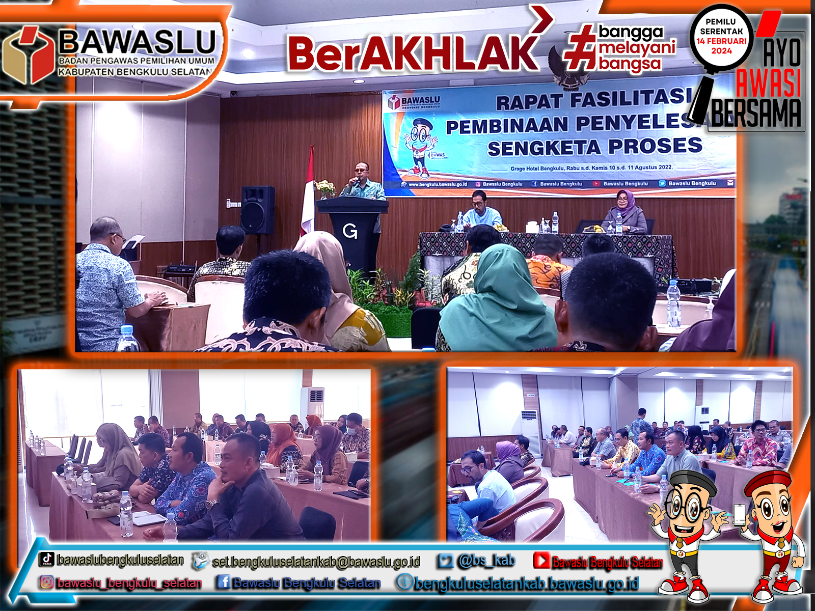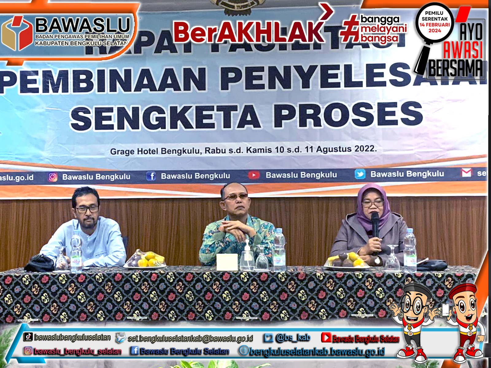 Bawaslu Bengkulu Selatan – Ketua dan Anggota Bawaslu Bengkulu Selatan Azes Digusti dan Noor Muhammad Tomi beserta Staf Sekretariat Nanda Pantra Jaya mengikuti Rapat Fasilitasi Pembinaan Penyelesaian Sengketa Proses oleh Bawaslu Provinsi Bengkulu dilaksanakan di Hotel Grage Bengkulu selama dua hari, Rabu s.d Kamis 10 s.d 11 Agustus 2022.