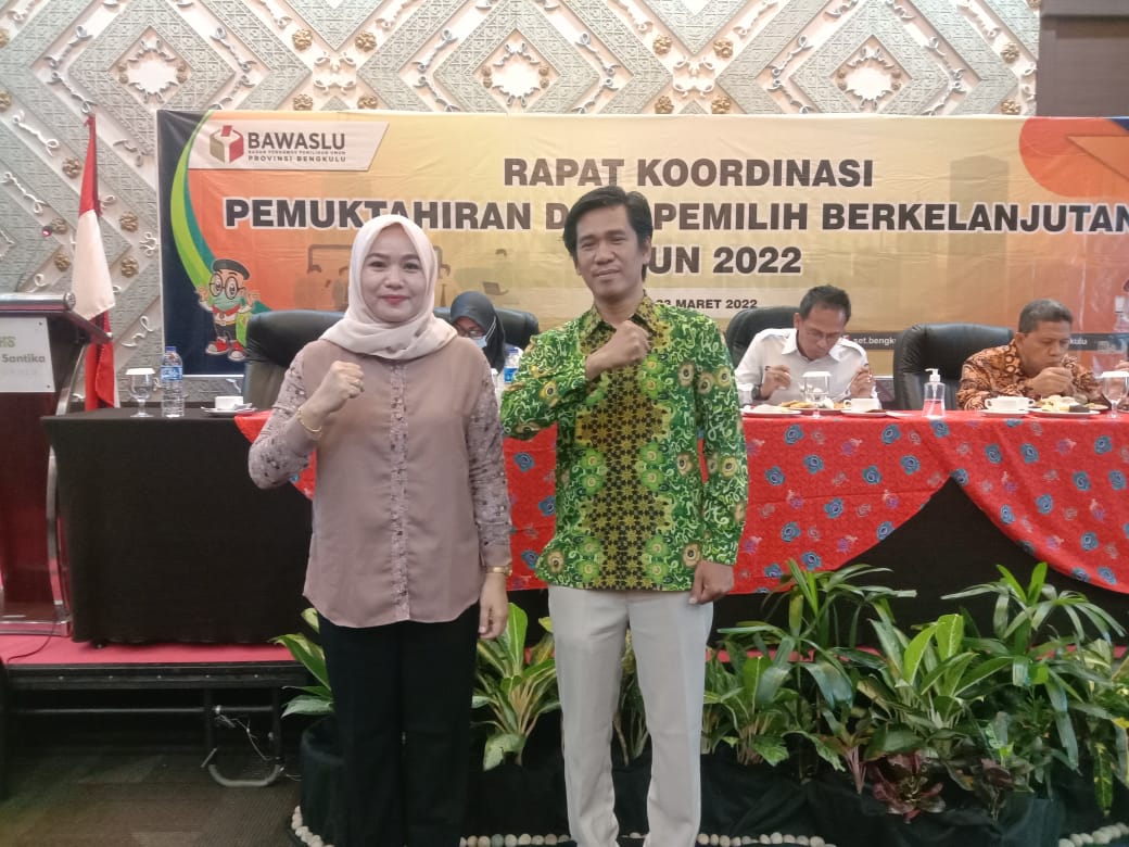Bengkulu, Bawaslu Kabupaten Bengkulu Selatan– Anggota Bawaslu Kabupaten Bengkulu Selatan Erina Okriani selaku Koordinator Divisi Pengawasan Hubungan Masyarakat dan Hubungan Antar Lembaga serta didampingi oleh staf sekretariat mengikuti Rapat Koordinasi Pemutakhiran Data Pemilih Berkelanjutan Tahun 2022 yang dilaksanakan oleh Bawaslu Provinsi Bengkulu bertempat di Hotel Santika kota Bengkulu. (23/3/2022).