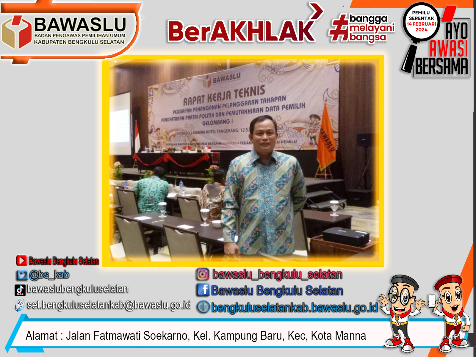 Kordiv HPPS Bawaslu Bengkulu, Selatan Noor Muhammad Tomi S,pd.,M.H Menghadiri acara Rapat Kerja Teknis Penanganan Pelanggaran