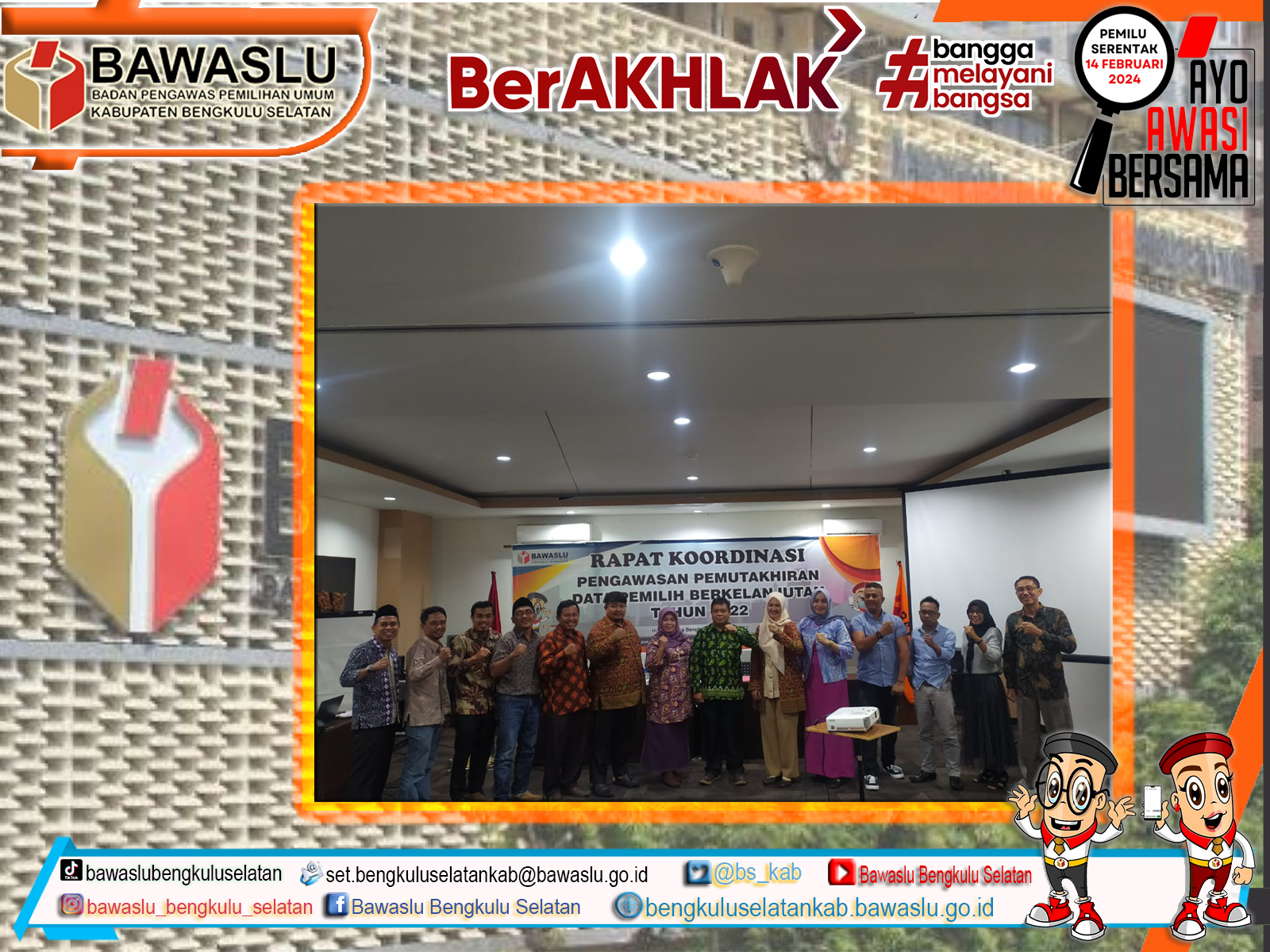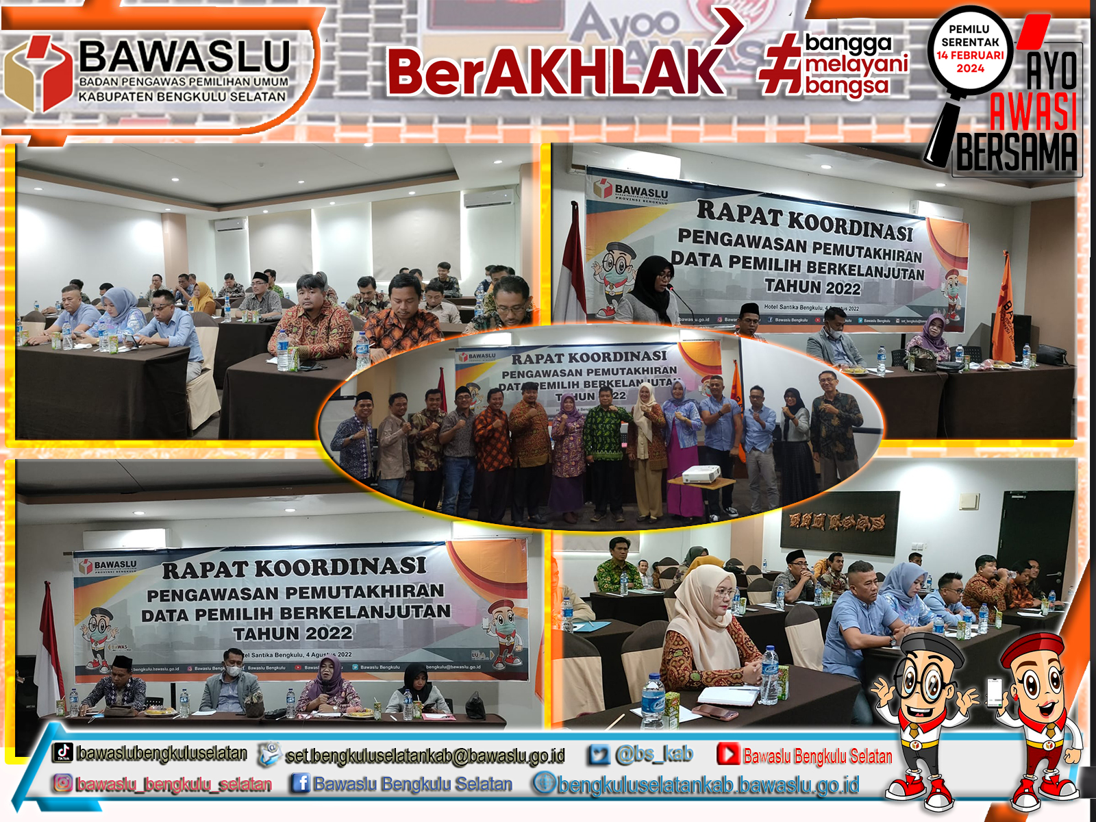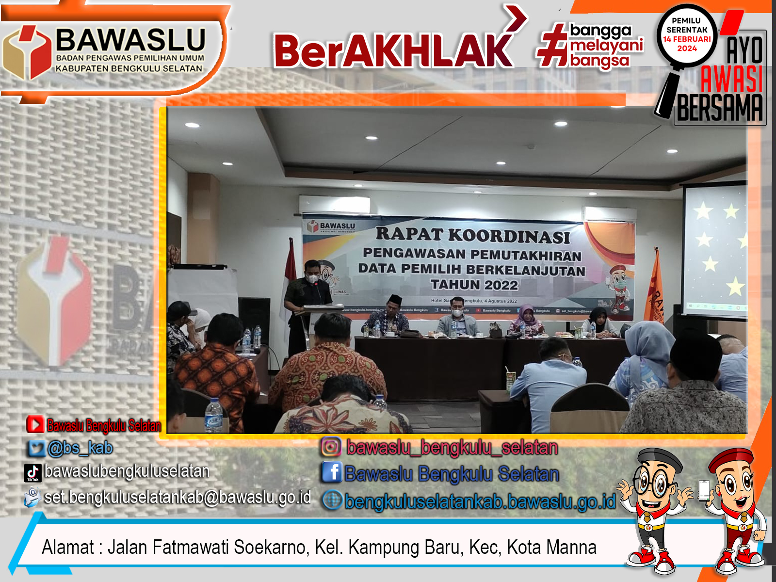 Bawaslu Bengkulu Selatan, Untuk melaksimalkan pencegahan pelanggaran pada tahapan Pemutakhiran Data Pemilih Berkelanjutan, Bawaslu Provinsi Bengkulu menggelar Rapat Koordinasi. Kegiatan yang di gelar di Hotel Santika Bengkulu, Kamis 4 Agustus 2022 ini dihadiri oleh Koordinator Divisi Pengawasan dan Hubungan Antar Lembaga serta satu orang staf dari Bawaslu Kabupaten/Kota se-Provinsi Bengkulu Kamis, 04/08/2022