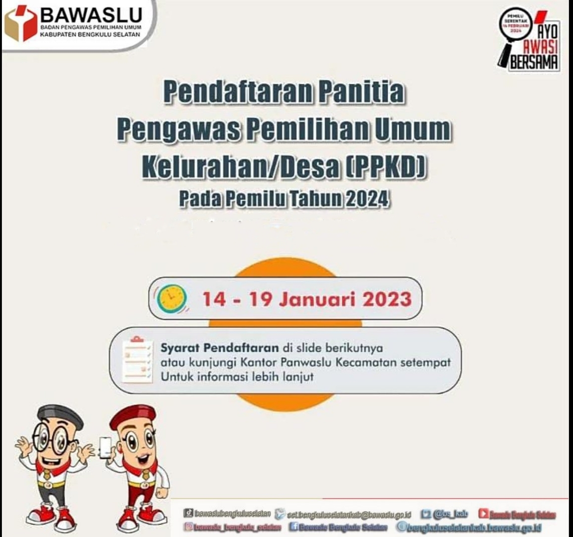 Bawaslu Kabupaten Bengkulu Selatan memanggil putra/putri terbaik Kabupaten Bengkulu Selatan untuk berpartisipasi dalam Pengawasan Pemilihan Umum Tahun 2024 dengan bergabung bersama Bawaslu Kabupaten Bengkulu Selatan sebagai Panitia Pengawas Pemilihan Umum Kelurahan/Desa Untuk Pemilu Serentak tahun 2024,