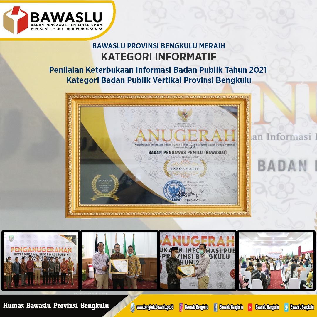 Bengkulu, Badan Pengawas Pemilihan Umum Provinsi Bengkulu – Badan Pengawas Pemilihan Umum Provinsi Bengkulu meraih anugerah keterbukaan informasi publik sebagai lembaga informatif kategori lembaga non-struktural se-Provinsi Bengkulu tahun 2021.